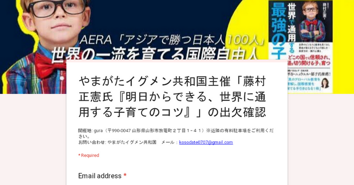 「世界で通用する最強の子育て」の著者である、藤村正憲氏の講演会がやまがたイグメン共和国主催で行われます。